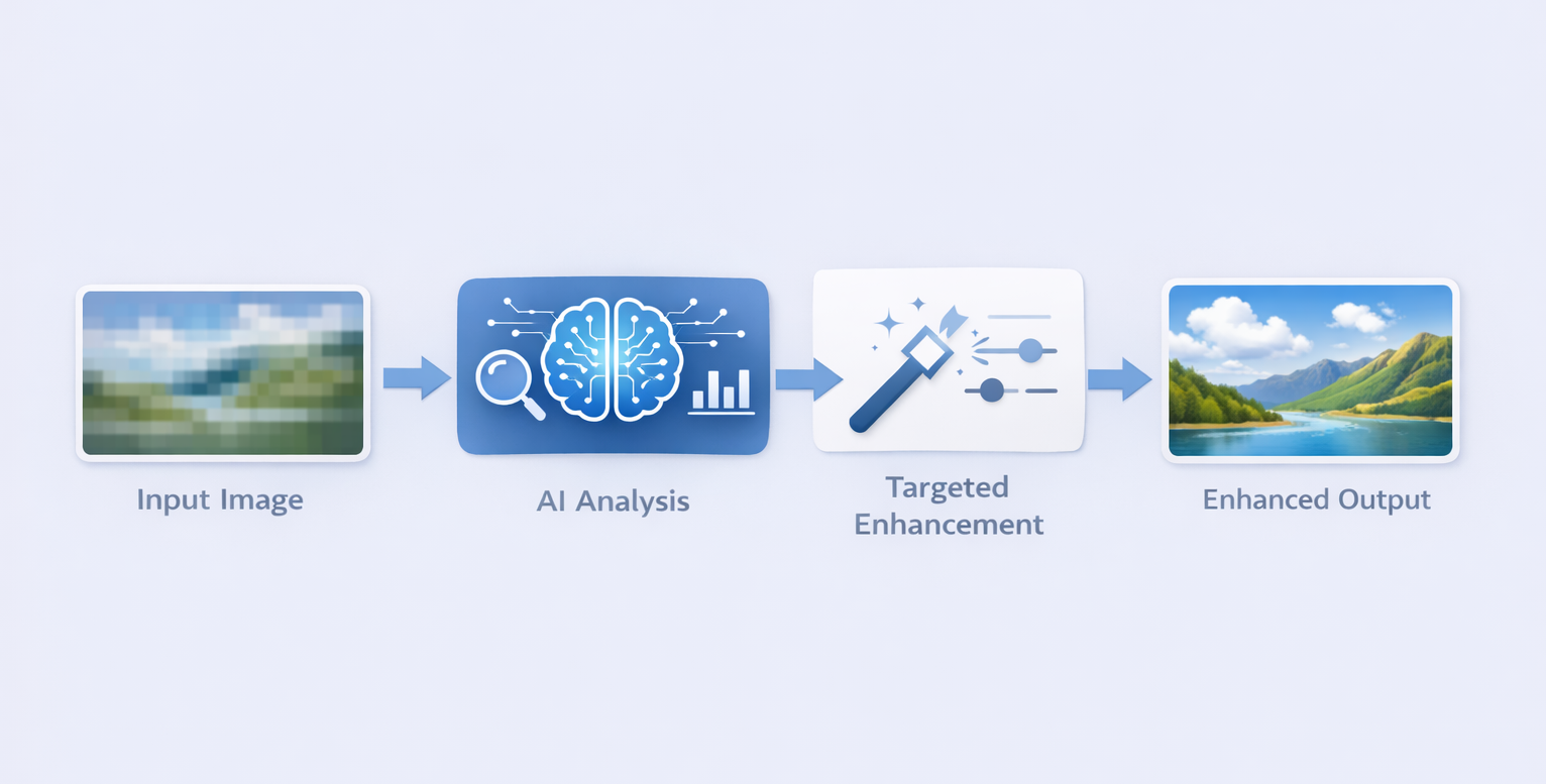 Although implementations vary between tools, the internal workflow of AI photo enhancement usually follows a similar sequence.